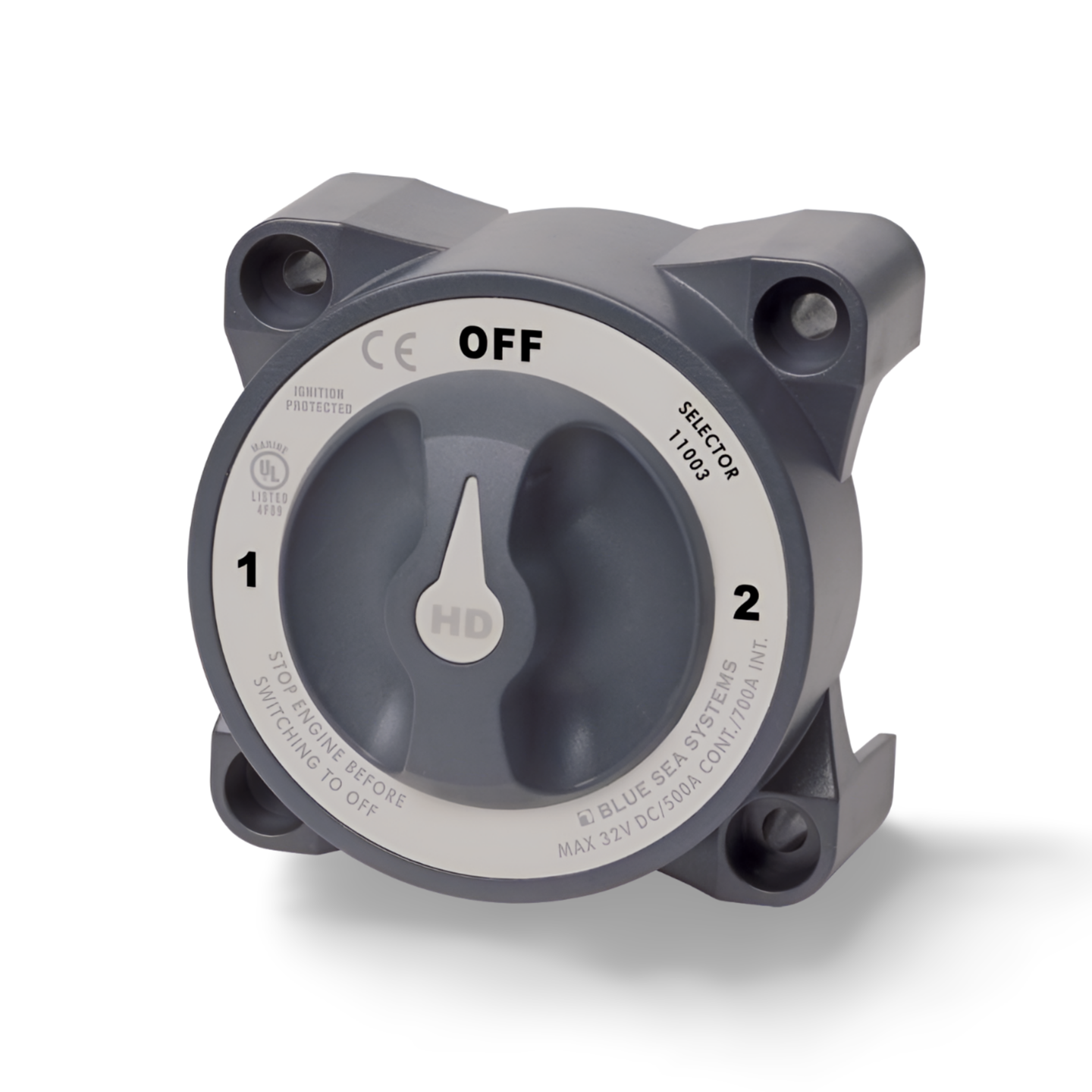 Blue Sea BS 11003 "Heavy Duty" 3-Positionen Batteriehauptschalter mit Lichtmaschinen Feldtrennung (AFD) für Diesel und Benzin Motoren. Der Schalter ist gasdicht und für zwei Batterien / Batteriebänke geeignet.