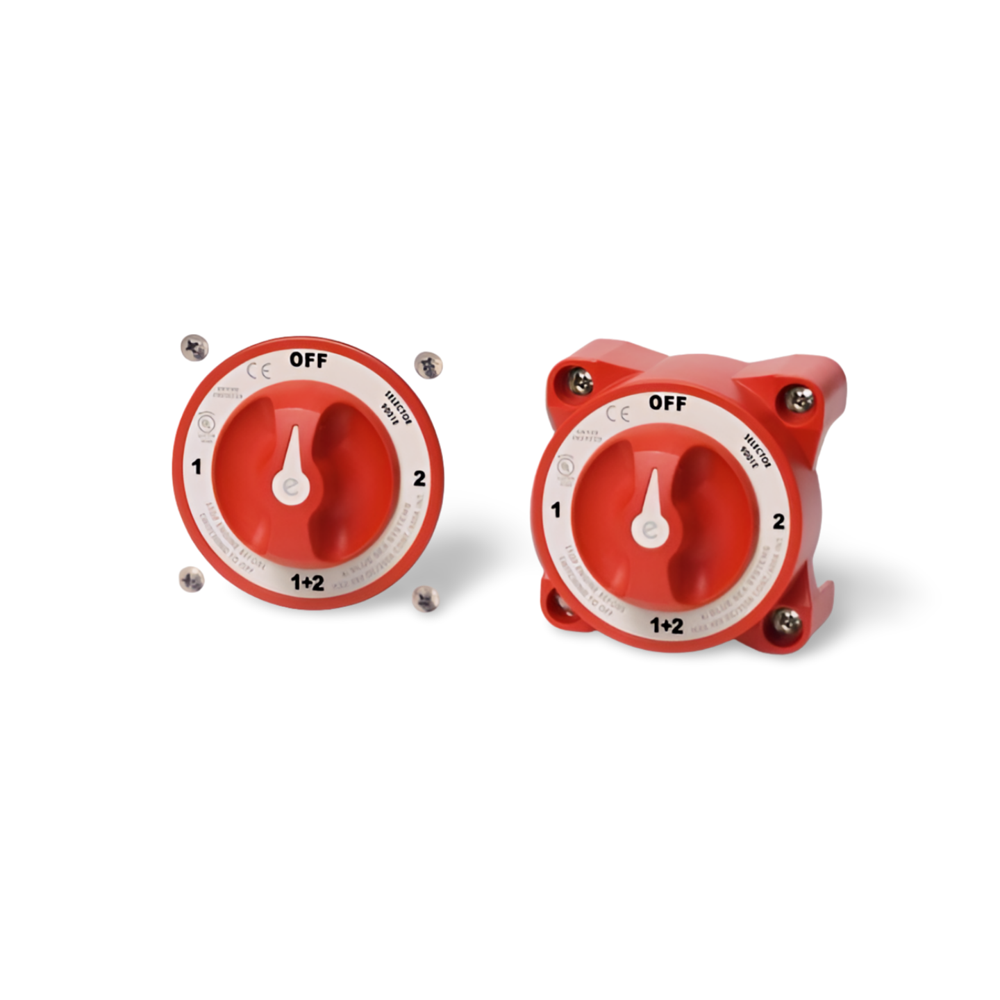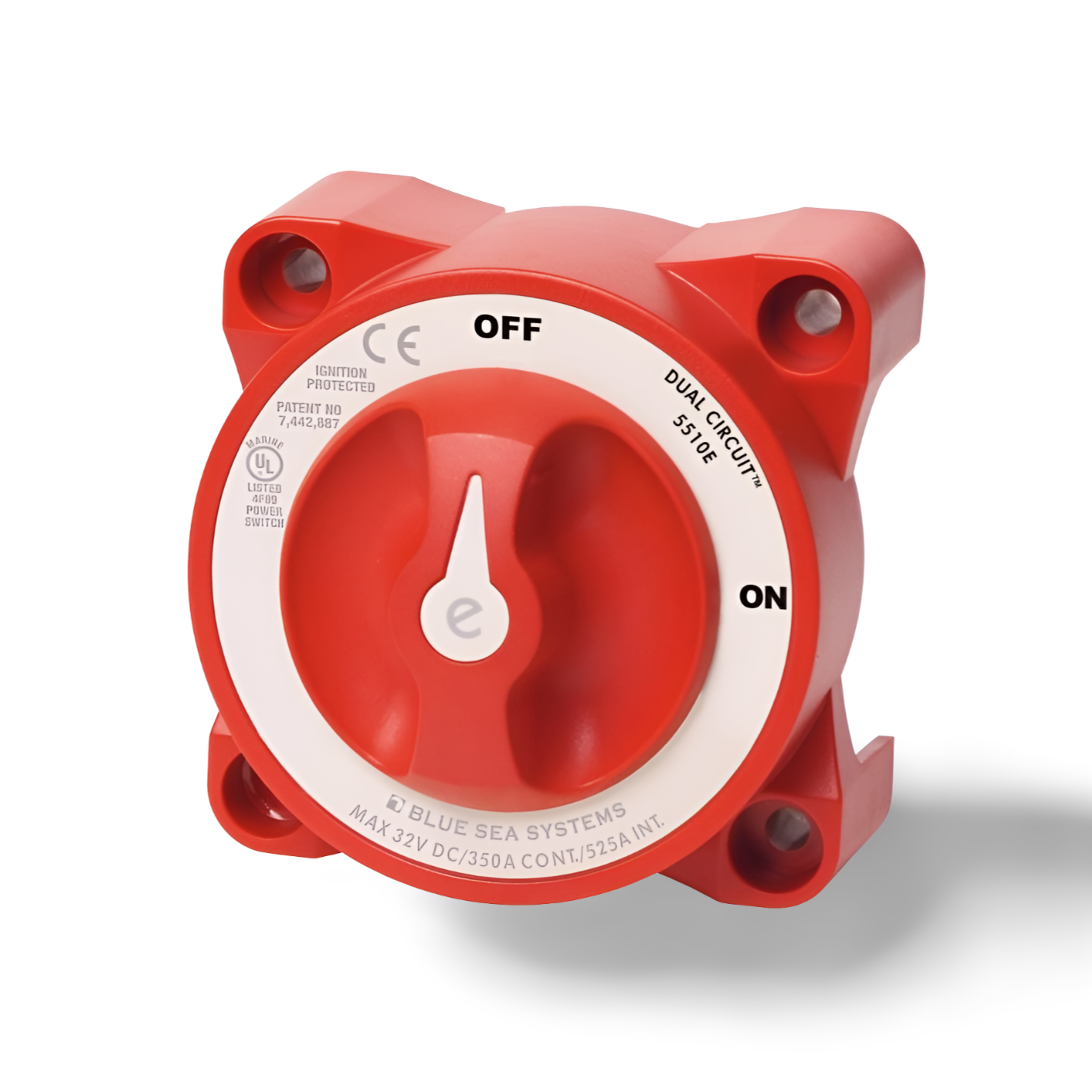 Blue Sea BS 5510e Zweikreis Batteriehauptschalter mit zwei Positionen für ON/OFF für Diesel und Benzin Motoren. Der Schalter ist gasdicht und für zwei Batteriebänke geeignet.