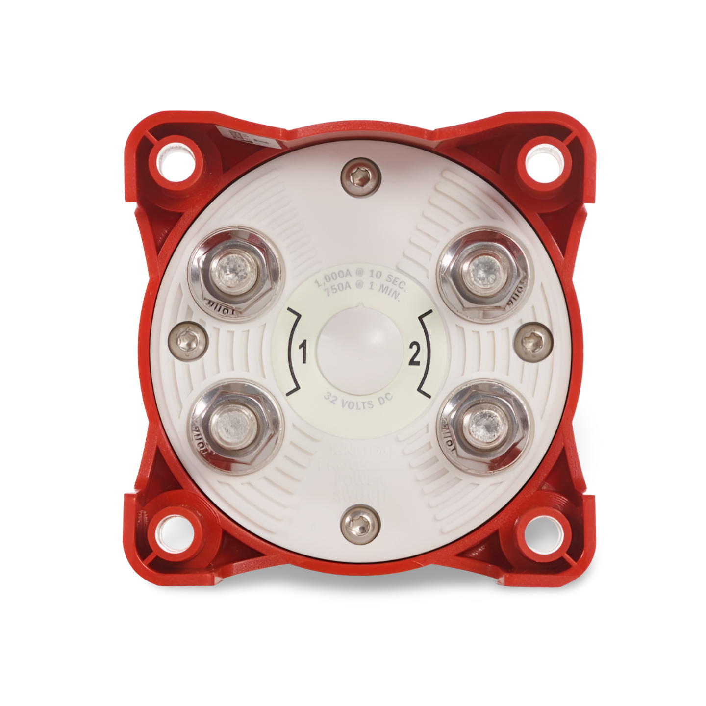 - Lichtmaschinen Feldtrennung (AFD): Nein (Trennschalter schützt die Dioden in der Lichtmaschine, wenn der Schalter bei laufendem Motor auf AUS geschaltet wird. Wenn der Trennschalter nicht zum Schutz der Lichtmaschine verwendet wird, kann eine LED an die AFD-Anschlüsse angeschlossen werden, um anzuzeigen, wenn sich der Batterieschalter in einer beliebigen Position aber nicht OFF befindet.)