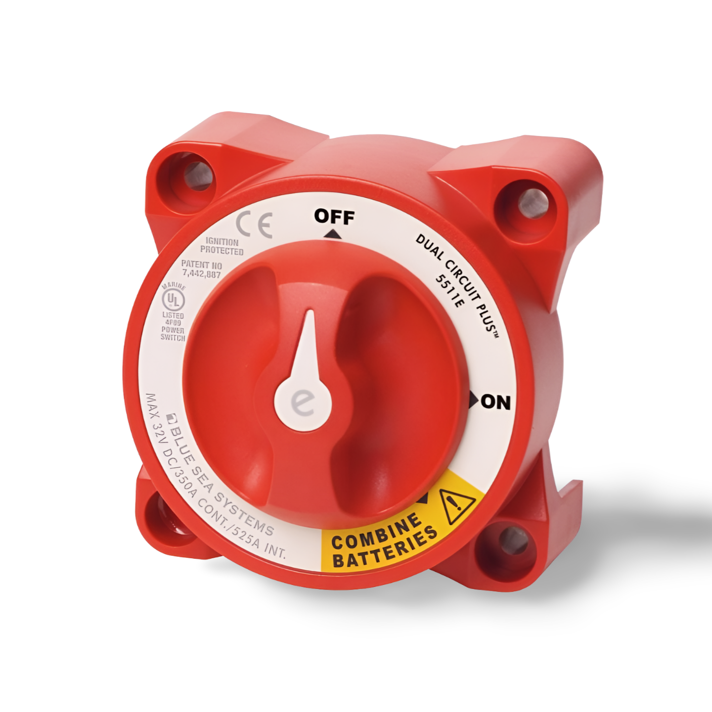 Blue Sea BS 5511e Zweikreis Plus Batteriehauptschalter mit drei Positionen für ON/OFF/Batteriekombination für Diesel und Benzin Motoren. Der Schalter ist gasdicht und für zwei Batteriebänke geeignet.